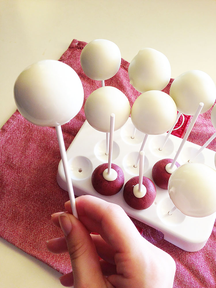 I got the cake pops out of the freezer, then one at a time, I dipped a cake pop stick into the melted chocolate and stuck it about two thirds of the way through a cake ball.