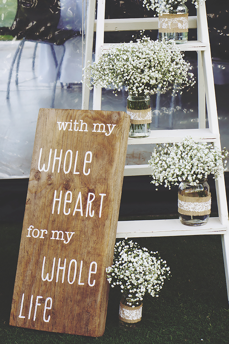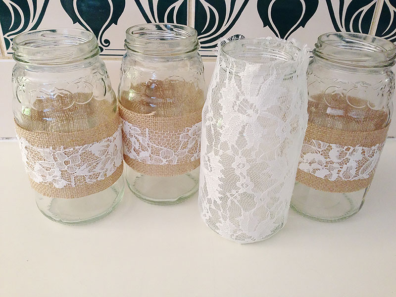 Another DIY job I had to do were all the decorative jars around the venue and all the center piece jars filled with baby's breath and other flowers. I did them up with strips of burlap, lace & twine, depending on what they were for. This kind of craft is so easy and relaxing. Something I did in-between the more difficult DIY work. Can I just say - hot glue guns are amazing! They help get things done fast! Super fast! The ones I decorated with JUST lace were some of my favourite! We hung them all at different heights behind the bridal table, and had battery powered fairy lights in them. It looked seriously incredible at night!