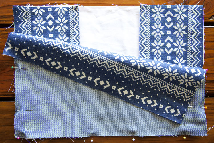 Lay down your cover lining. Then lay your two sleeves down, at the sides of the lining, keeping all the open edges together. Then sandwich it together with your main cover fabric going right side down, as shown. Pin all the way around, holding it together firmly.