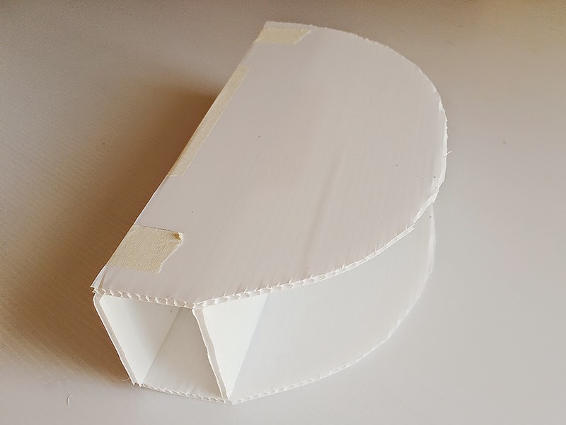 First, get your pieces together. To do this, I quickly printed out a cartoon picture of half a watermelon and then traced it on some white cardboard. Then I measured two strips of cardboard the same length as the watermelons straight edge and made it 2" wide. Then I needed one longer strip of cardboard the same length as the rounded edge of the watermelon, and the same width (2") as the other strips.