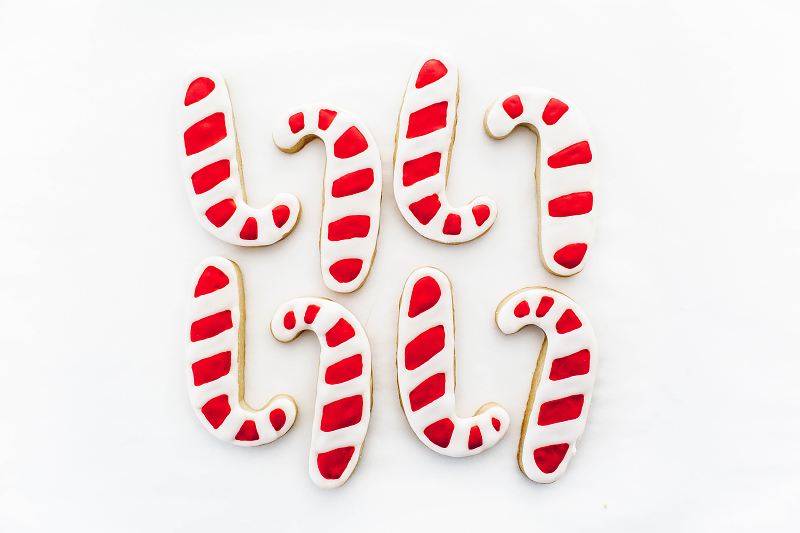 I used a non-coloured Medium Consistency Icing around the edge of the candy cane, and then continued with the white part of the stripes. Less is more here, because you don't want to pipe on too much and have it spread over the whole cookie! So just pipe lines across to create the stripes, and then use a modelling stick or toothpick to move around the icing a little and widen the stripe if needed. Once dried, I then used a Medium Consistency Icing, coloured with Americolor #120 Super Red to fill in the holes.