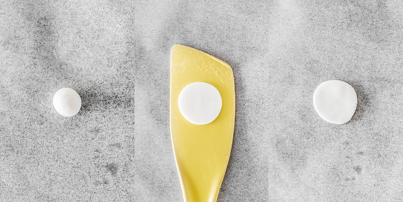 Firstly, I wanted to create little Gold Fondant Stars to place at the top of my Christmas Trees. I already had left over Satin Ice Fondant from when I made Aprils Birthday Cake, so I used that. Pull out a sheet of Baking Paper, and roll some Fondant into a ball about the width of a 10c piece. Squish the ball flat with a spatula or something similar, peel it off and lay it on your baking paper.